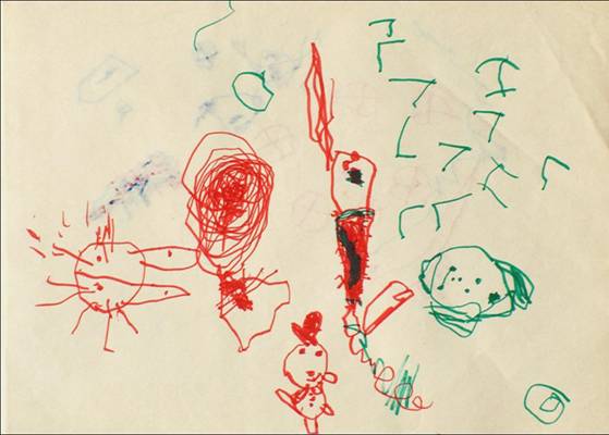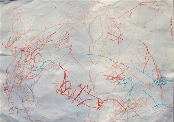 kép Istvánka rajza, másfél éves, ahol még a különböző firkatípusok véletlenszerűen kerülnek egymás mellé.